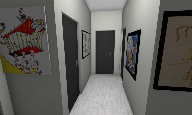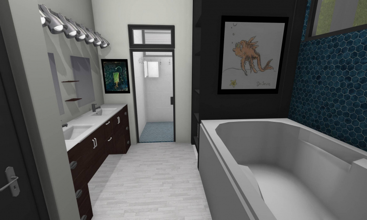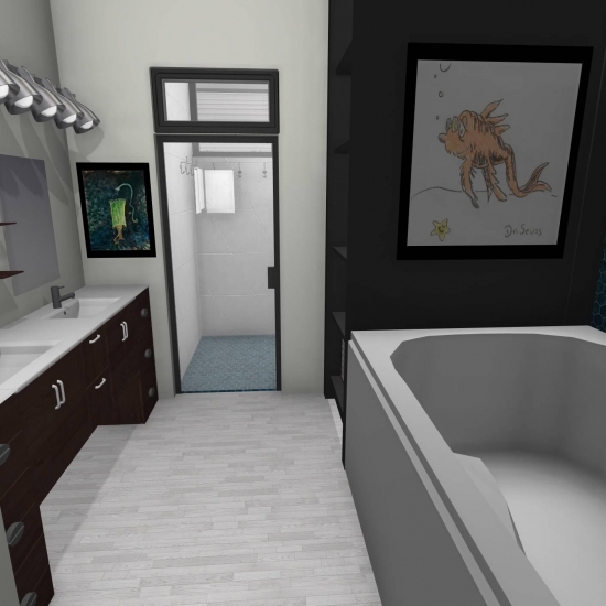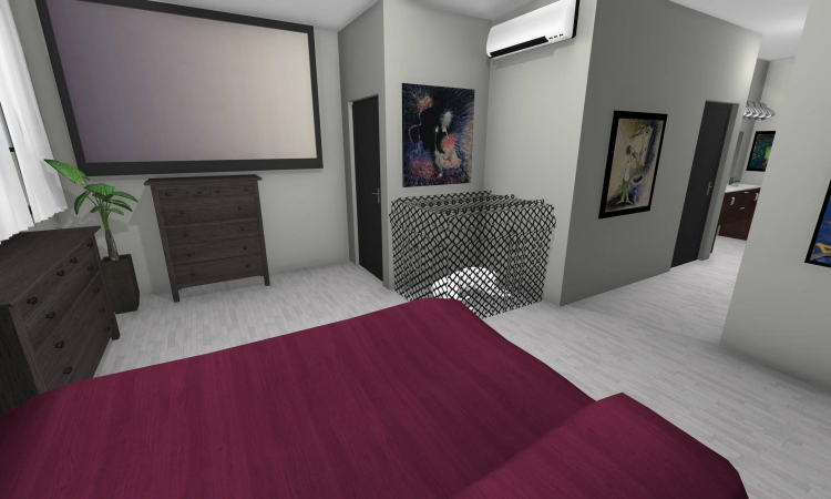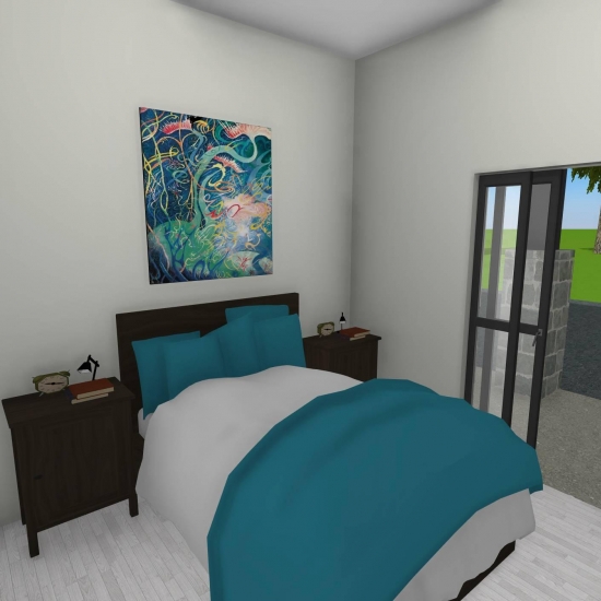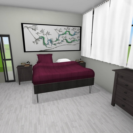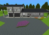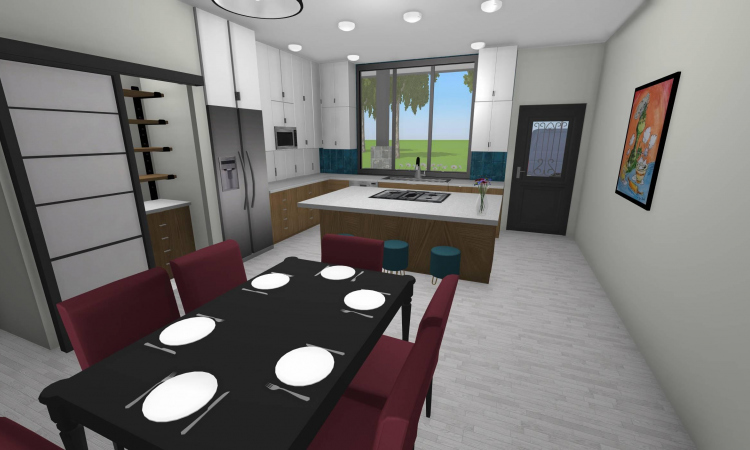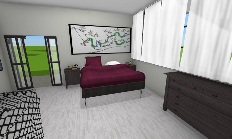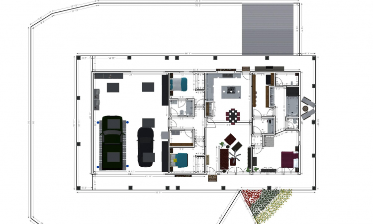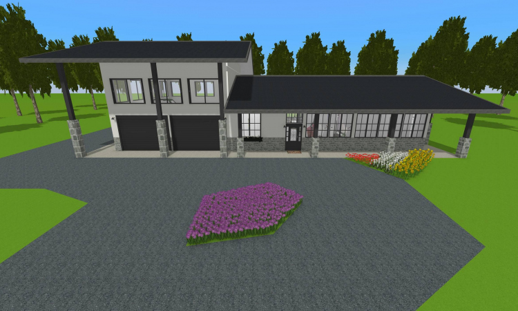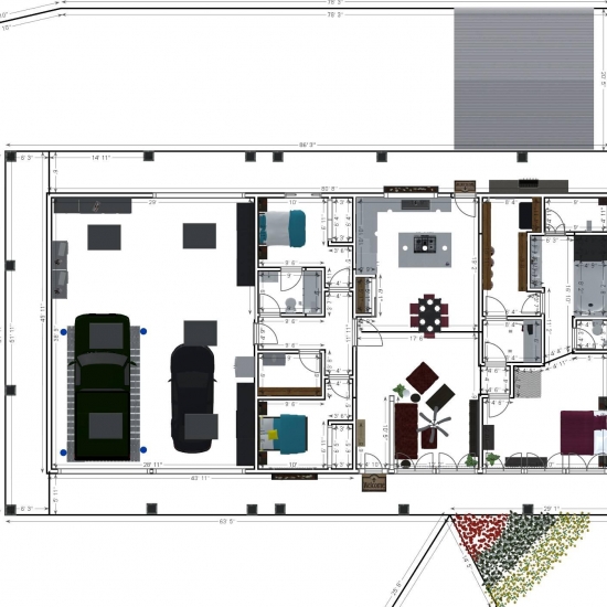 3 bedroom barndominium with attached garage. Garage has car lift for mechanical work. Master bedroom has ensuite bathroom that leads to walk in closet which leads to laundry room. Laundry can be done and put away in closet quickly. Guest bedrooms are partitioned off from main living area to conserve heat and air when not in use. Open kitchen, dining room and living room design. Partition at front door to block livingroom from front door drafts. Grilling area jusst outside kitchen door. Paved driveway circles house so groceries can be taken straight to kitchen through back door. Interior design is modern with Dr. Seuss paintings hanging on the walls. Large kitchen window above sink so you can look out while doing dishes. Stove and oven in large kitchen island so you can see and converse with guests while cooking. Sliding pocket doors where doors would usually be open or no privacy is needed. One guest bedroom has shared hallway bathroom access to provide ensuite bathroom feel while still allowing guessts bathroom access. That same guest bedroom has an exterior door to allow for more independent living with an aging relative or adult child. The garage has a mechanics lift to work on vehicles.