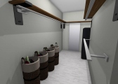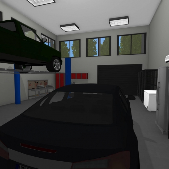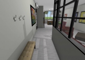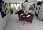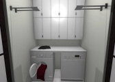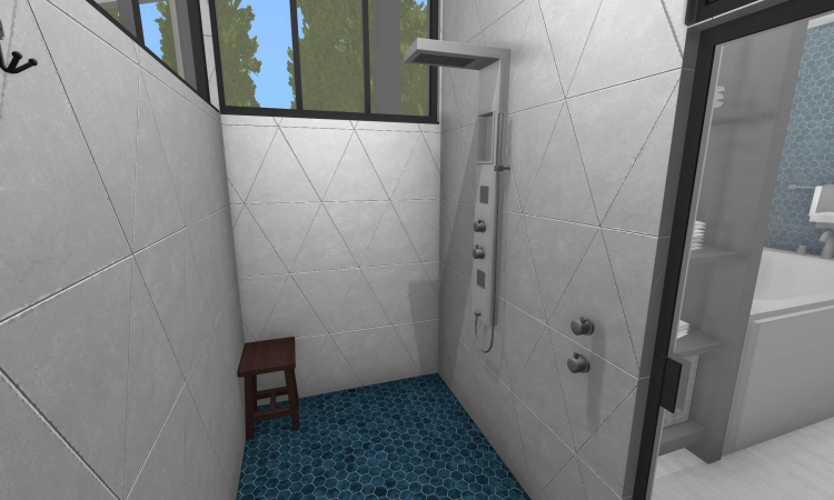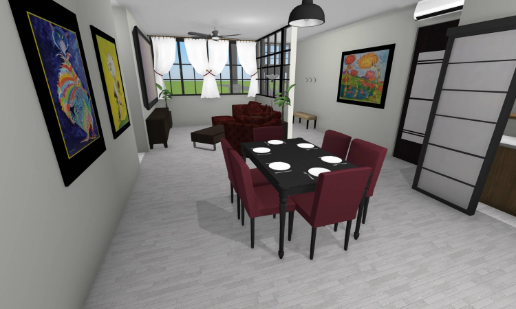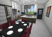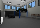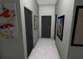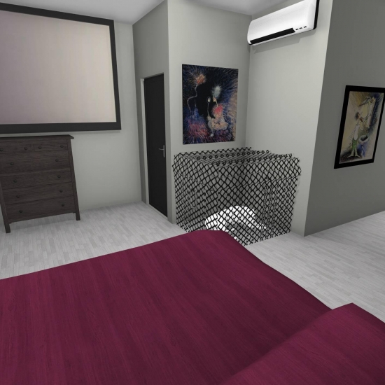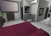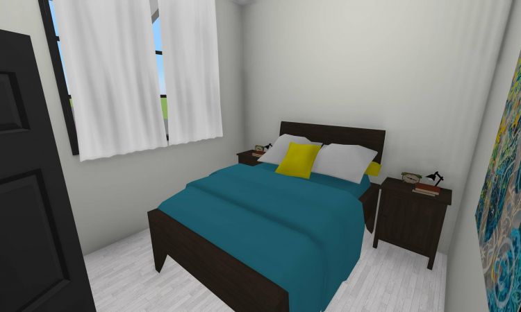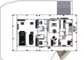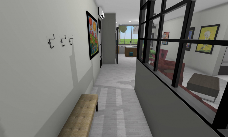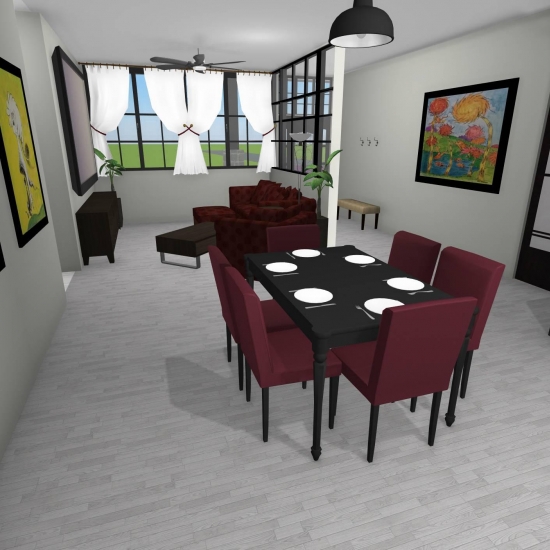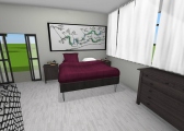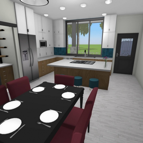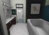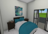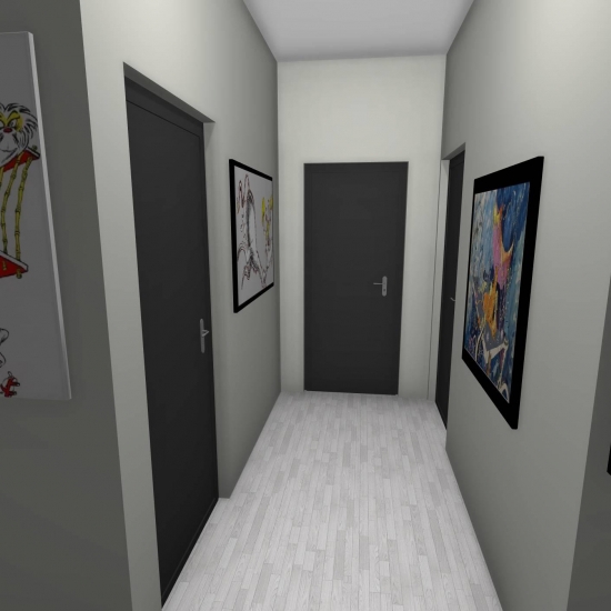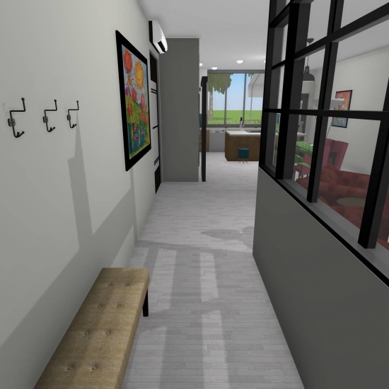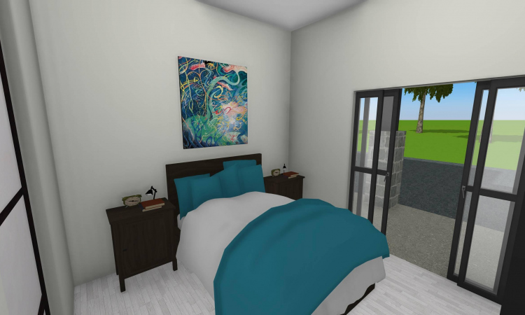 3 bedroom barndominium with attached garage. Garage has car lift for mechanical work. Master bedroom has ensuite bathroom that leads to walk in closet which leads to laundry room. Laundry can be done and put away in closet quickly. Guest bedrooms are partitioned off from main living area to conserve heat and air when not in use. Open kitchen, dining room and living room design. Partition at front door to block livingroom from front door drafts. Grilling area jusst outside kitchen door. Paved driveway circles house so groceries can be taken straight to kitchen through back door. Interior design is modern with Dr. Seuss paintings hanging on the walls. Large kitchen window above sink so you can look out while doing dishes. Stove and oven in large kitchen island so you can see and converse with guests while cooking. Sliding pocket doors where doors would usually be open or no privacy is needed. One guest bedroom has shared hallway bathroom access to provide ensuite bathroom feel while still allowing guessts bathroom access. That same guest bedroom has an exterior door to allow for more independent living with an aging relative or adult child. The garage has a mechanics lift to work on vehicles.