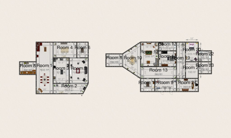 Casa de dos plantas, cuatro salas, comedor, cocina, lobby, sala de juegos, gimnasio, tres habitaciones, cinco baños y despacho.