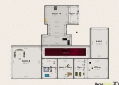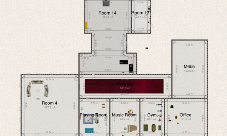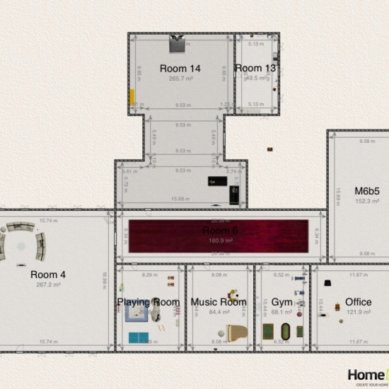 A home with 1 living room,1 bedroom, dressing room, playing room, music room, gym, office, and kitchen. And a small garden.